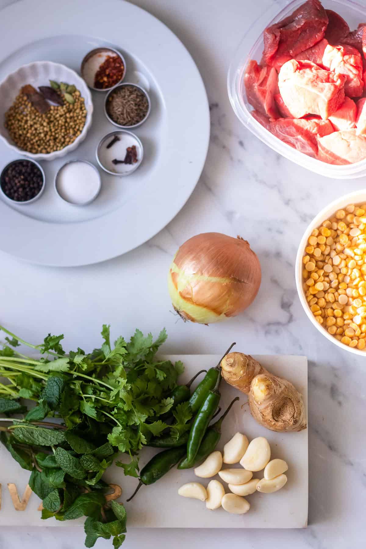 - Combine all the ingredients EXCEPT the green masala ones in a pot with 2.5-3 cups of water, bring to a boil and simmer on low for 50-60 minutes or until the meat and daal are tender. Check halfway through, add water if needed.